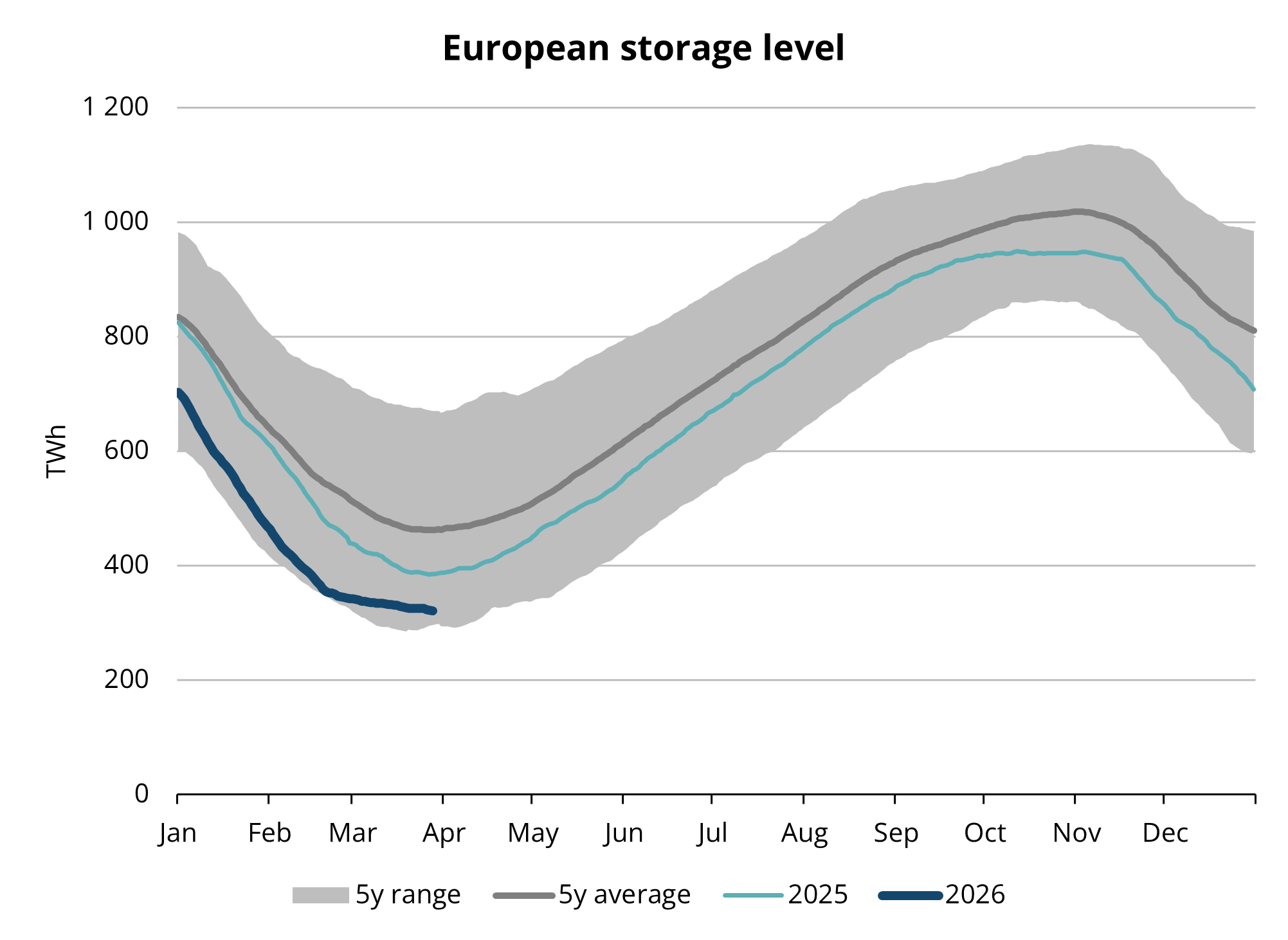 The first quarter of 2026 was characterised by a sharp tightening of the European gas market balance, driven by a combination of colder-than-normal weather, accelerated storage withdrawals and a major geopolitical shock in the Middle East that significantly disrupted global LNG supply. Compared to the relatively more balanced conditions observed in late 2025, the market shifted rapidly into a structurally tighter and risk-driven environment.