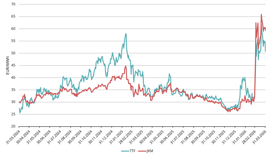 Pärast USA ja Iraani vahelise konflikti eskaleerumist halvenesid turutingimused märtsi alguses veelgi. Pinged süvenesid eriti pärast rünnakuid olulise tähtsusega energiarajatistele Pärsia lahe piirkonnas, sealhulgas Katari Ras Laffani tööstuskompleksile, mis moodustab ligikaudu 20% ülemaailmsest LNG tootmisvõimsusest. Rünnakute tulemusel peatati ja seejärel vähendati LNG tootmist, eemaldades globaalselt turult märkimisväärse osa pakkumisest. Turureaktsioon oli vahetu ja tugev – sai selgeks, et ligikaudu 17% Katari LNG mahust jääb kahjustuste tõttu 3–5 aastaks turult eemale.