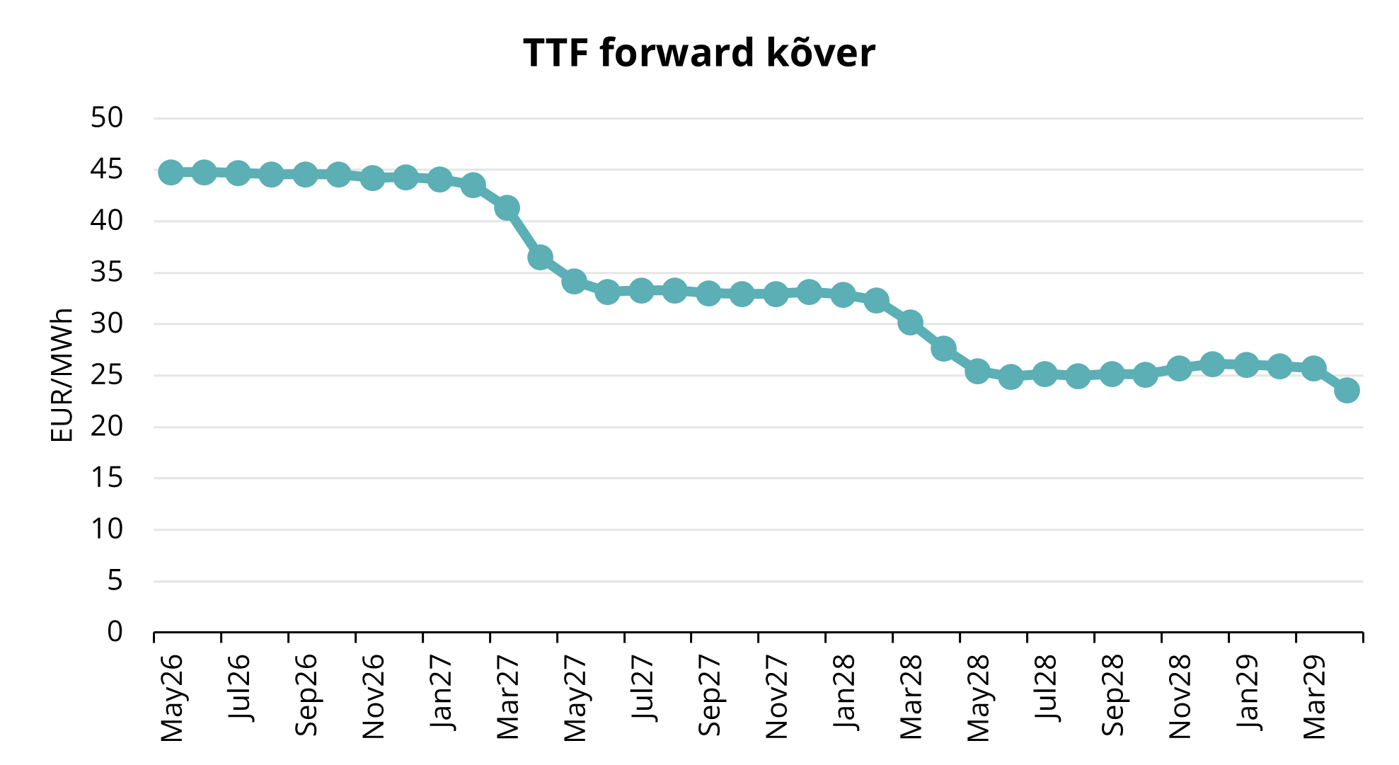 ICE Endex TTF lähima kuu võrdlushinna keskmine tase 2026. aasta I kvartalis oli 40,148 EUR/MWh, mis on enam kui 33% kõrgem võrreldes 2025. aasta III kvartaliga. Lähima täiskuu, mai 2026, forward-lepingud sulgusid 31. märtsil tasemel 50,757 EUR/MWh. Märtsis liikus 2026. aasta forward-kõver backwardation’i, mis tähendab, et iga järgmine kuu on hinnastatud madalamalt kui eelmine (vt joonis 2). Eriti järsk hinnalangus on nähtav märtsi 2027 ja aprilli 2027 vahel. Kogu 2027. aasta kalendriaasta püsib samuti backwardation’is.