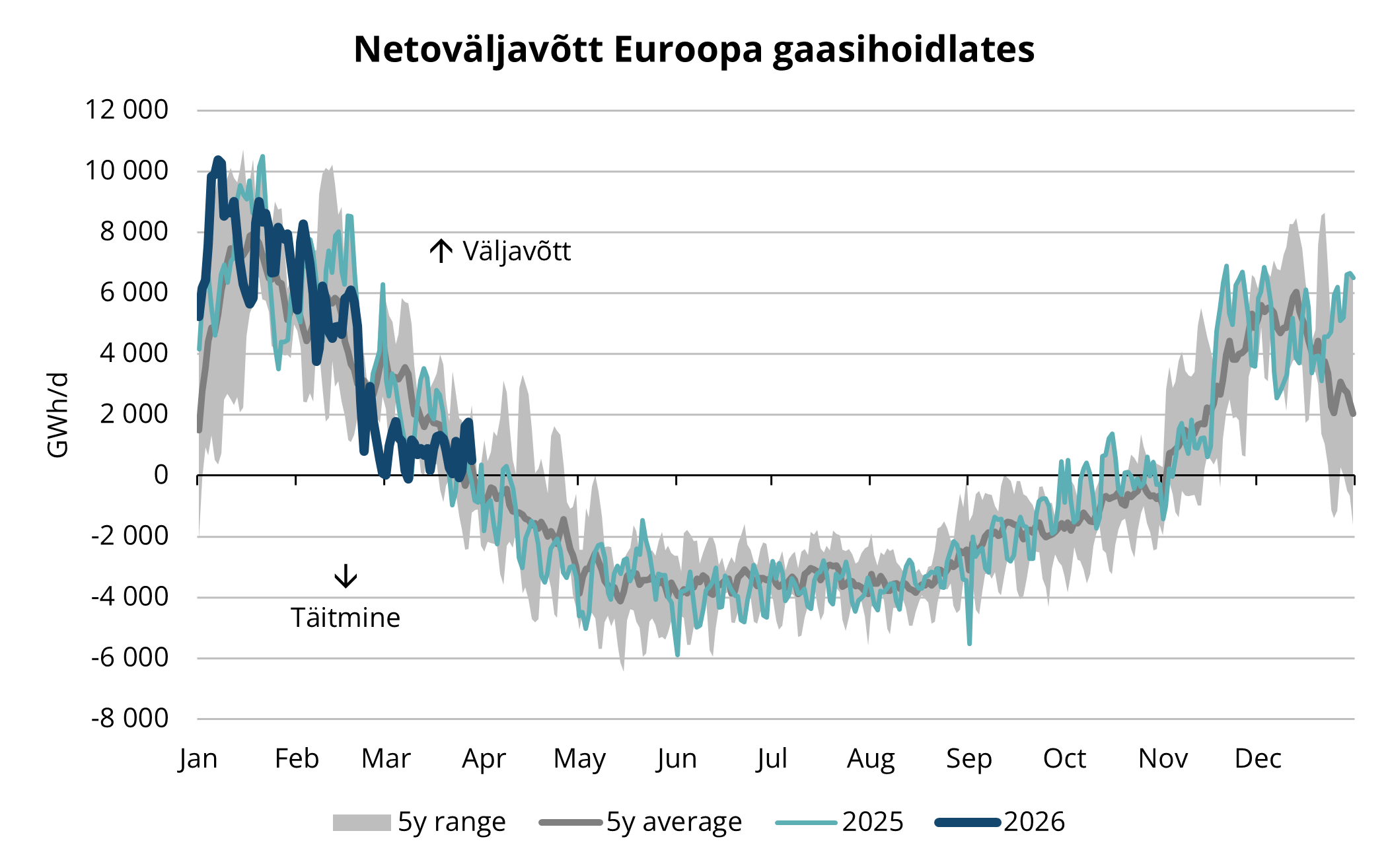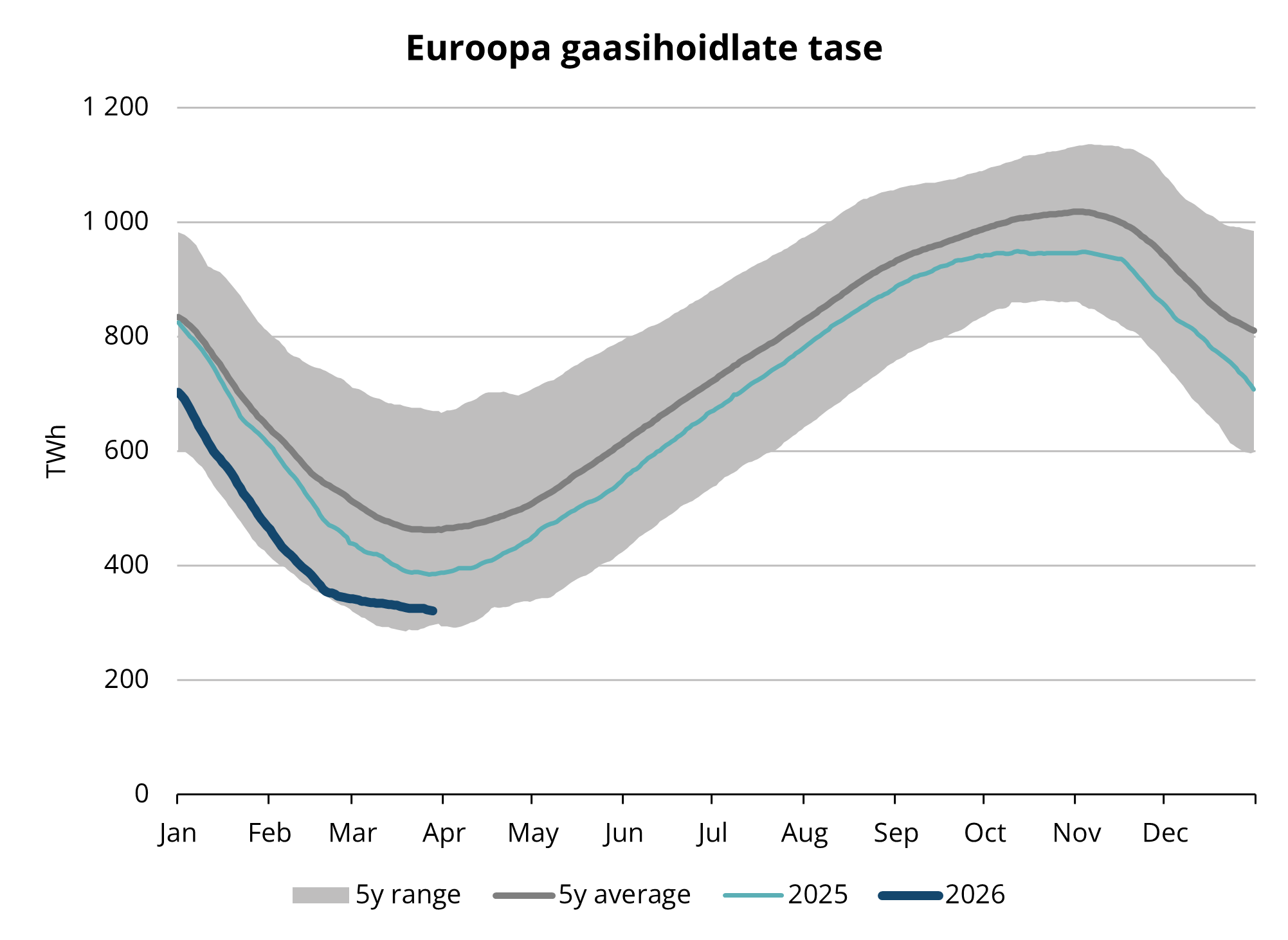 Vaadates ette 2026. aasta teisele kvartalile, nihkub turu fookus selgelt hoiustamise tempole, LNG kättesaadavusele ja geopoliitilise olukorra arengule. Kuigi kütteperioodi lõppemine vähendab hooajalist nõudlust, hoiab ajalooliselt madal varude tase impordivajaduse kõrgel ning avaldab jätkuvat survet hindadele. Euroopa sõltuvus LNG-st püsib suur ning konkurents lastide pärast tõenäoliselt tiheneb, kuna globaalne pakkumine on lühiajaliselt piiratud.