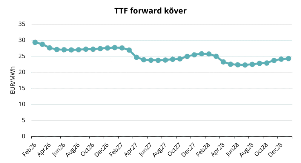 Ebatavaliselt külm 2025. aasta lõpp ja 2026. aasta algus tõid kaasa oodatust suuremad väljavõtted Euroopa gaasihoidlatest, rõhutades turu tundlikkust ilmastiku suhtes. Kuna Euroopa liigub 2026. aasta I kvartalisse, jäävad gaasihinnad valdavalt ilmastikust sõltuvaks. Hoidlate tasemed on madalamad kui varasematel talvedel, mistõttu on turul piiratud puhver pikemate külmaperioodide absorbeerimiseks. Kui tavapärasest külmemad tingimused püsivad talve lõpus või kui veebruaris-märtsis saabub hiline külmalaine, võivad TTF hinnad järsult tõusta, kajastades pingestunud tasakaalu ja kiirenenud varude vähenemist. Vastupidisel juhul tulenevad peamised hinnalanguse riskid leebemast ja tuulisemast ilmast, mis vähendaks gaasinõudlust kütteks ja elektritootmiseks ning võimaldaks varudel talve lõpuni mugavamalt kesta.