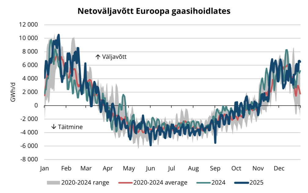 Leebe ilm neljandas kvartalis tagas varustuskindluse, kuid süsteemi veamarginaal püsib piiratud. Pikema külmaperioodi korral võivad kiired väljavõtted kiiresti turu tasakaalu pingestada, eriti kui lisanduvad LNG tarnete katkestused või infrastruktuuri rikked. Tõepoolest, novembri lõpus ja detsembris täheldati kõrgendatud väljavõtteid (vt joonis 4), mis muudab hoidlate dünaamika oluliseks jälgimisobjektiks I kvartalis.