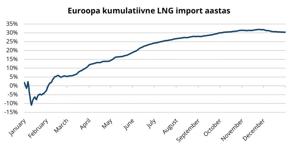 Tugevad LNG tarned võimaldasid Euroopal kompenseerida madalamaid hoidlate tasemeid ja vältida järske hinnatõuse. Siiski võivad esimeses kvartalis hoidlate tasemed olla proovile pandud pikema külmaperioodi või laiaulatusliku infrastruktuuri häire korral, mis jätab avatuks võimaluse hinnatõusuks.