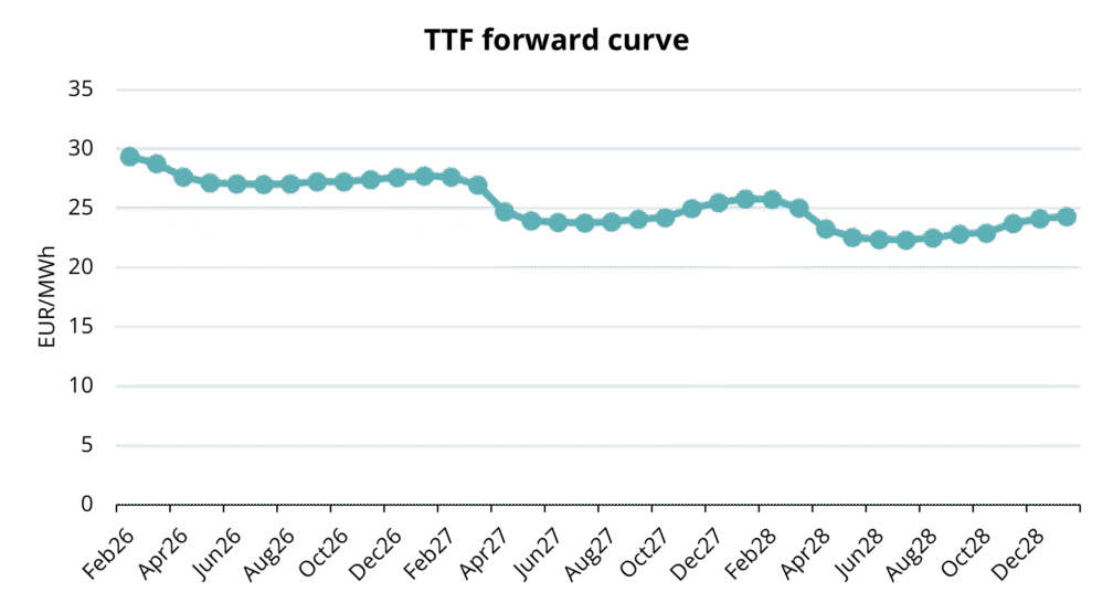 Средняя цена эталонного фьючерса ICE Endex TTF в IV квартале 2025 года составила 30,15 EUR/MWh — примерно на 9% ниже, чем в III квартале, несмотря на начало отопительного сезона. Фьючерсы на ближайший полный месяц — февраль 2026 года — закрылись на уровне 28,16 EUR/MWh 31 декабря. Форвардная кривая осталась в состоянии бэквордации: ближайшие контракты торговались около 29 EUR/MWh, тогда как летние — ближе к 27 EUR/MWh (см. рис. 2).