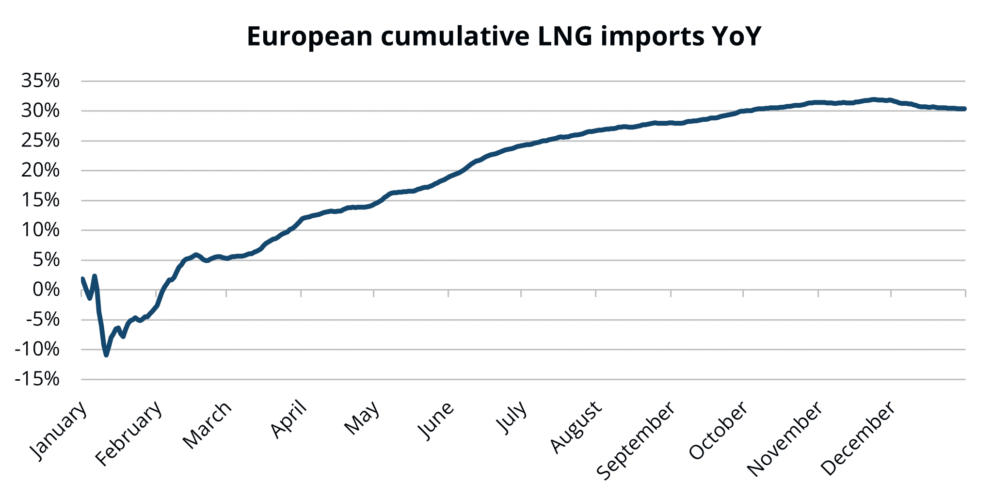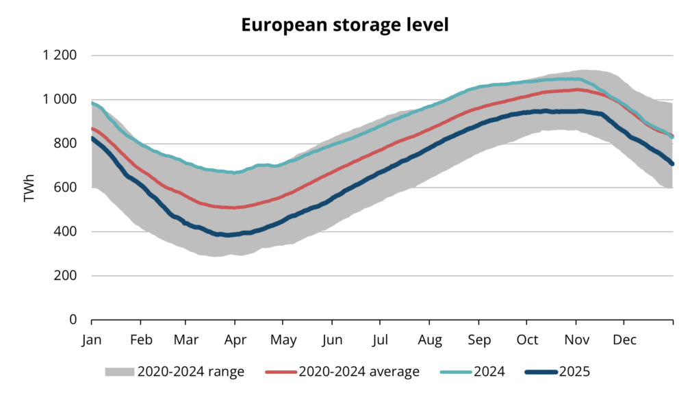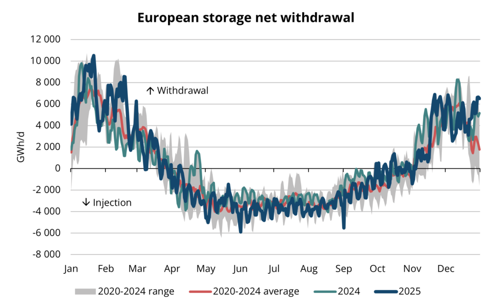 Хотя мягкая погода в IV квартале помогла обеспечить достаточное предложение, запас прочности системы остаётся крайне ограниченным. В случае продолжительной холодной волны ускоренные темпы отбора газа из хранилищ могут быстро привести к ужесточению баланса, особенно при одновременных перебоях в поставках СПГ или сбоях инфраструктуры. В конце ноября и декабре темпы отбора действительно были повышенными (см. рис. 4), что делает динамику запасов ключевым фактором для наблюдения накануне I квартала.